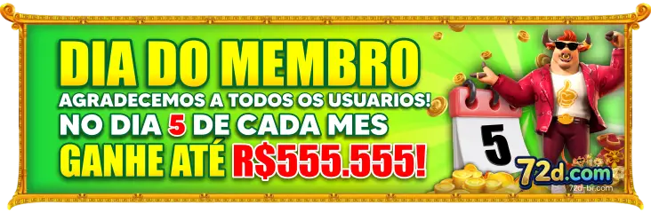 Celebrando nossos usuários fiéis, o Dia do Membro acontece todo dia 5 de cada mês, conforme ilustrado na imagem, trazendo prêmios incríveis. Nesta data especial, você pode ganhar até R$555.555, como forma de agradecimento por fazer parte da comunidade. É uma oportunidade imperdível para aumentar seus ganhos, aproveitar bônus especiais e sentir-se valorizado como membro. Marque no calendário e não perca essa chance mensal de ganhar muito mais!